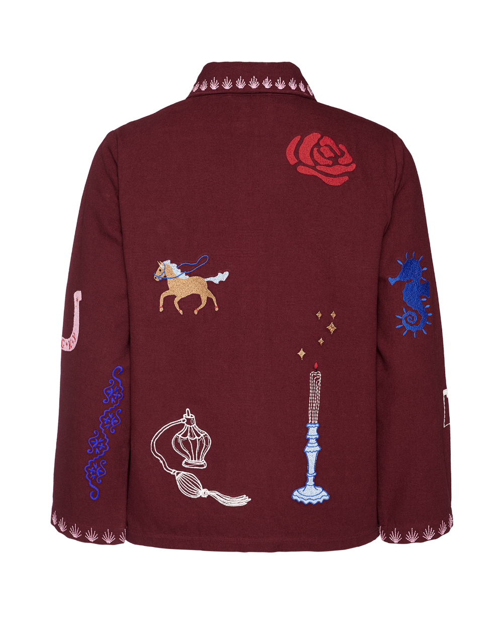 My Organic Cotton Jacket fra Sissel Edelbo er en afslappet skjortejakke med knapper foran. Jakken har en lille skjortekrave og lange ærmer med manchetter. Jakken er lavet i 100% økologisk bomuldskanvas og er smukt dekoreret med kontrastfarvede broderier. KÆRLIGHED skrevet på hindi og en Hamsa-hånd (et universelt tegn på beskyttelse, kraft og styrke). Alle de forskellige broderier på jakken er inspireret af Sissel Edelbos kærlighed til Indien.
