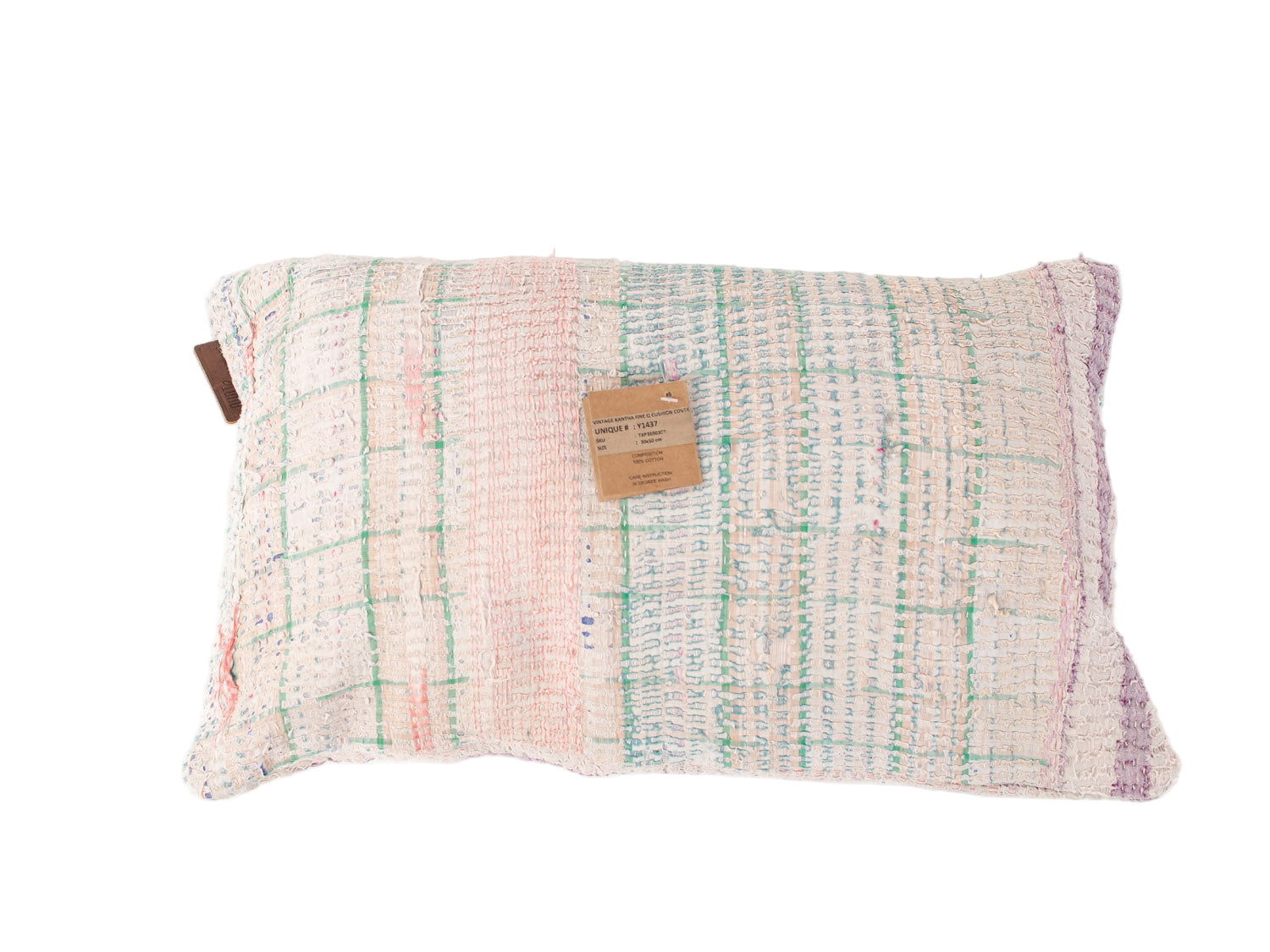Unika pude syet af vintage sarier i skønne farver, som er syet sammen med masser af håndsyninger. De bløde vintage sarier er syet sammen lag på lag - til en blød pude, hvor sariernes forskellige slitage giver et smukt og helt unikt look, hvor underliggende farver og mønstre 'titter frem'.
